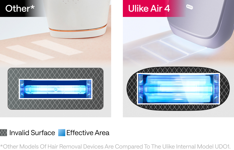 *The hair removal area of 360 square centimeters in 1 minute is calculated based on the light emission port area of 3.3 square centimeters x (0.4s flash speed + 0.7s pulse interval) x dual pulses (two light emissions), using the product for 1 minute.